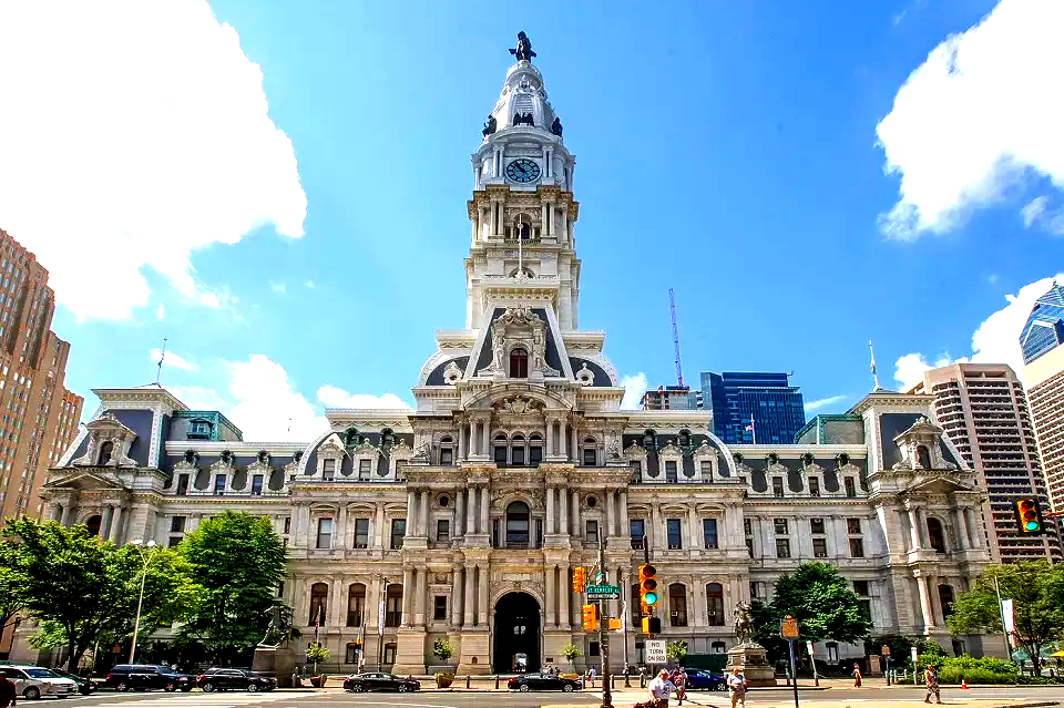 Philadelphia City Hall is a historic architectural masterpiece completed in 1901 and designed in the French Second Empire style. Standing at 167 meters, it was the tallest habitable building in the world until 1908, and it remains the world’s tallest masonry building. The tower is crowned with a 37-foot-tall bronze statue of city founder William Penn, which itself is a prominent feature of the Philadelphia skyline.