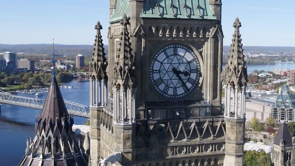 At 92.2 meters tall, the tower is adorned with stone carvings of gargoyles, grotesques, and symbolic motifs representing Canada’s history and values. The four large clock faces measure over 4 meters in diameter, ensuring visibility from across the capital city. Inside, the tower houses a carillon of 53 bells that ring out during national ceremonies and special events.