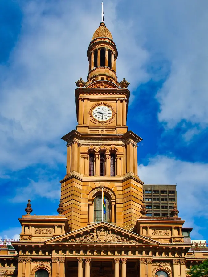 The Town Hall Clock Tower in Sydney, Australia, is part of the Sydney Town Hall complex, a civic building completed in 1889. Designed in Victorian Second Empire style, the building is regarded as one of the finest examples of 19th-century architecture in the city. The clock tower rises above the sandstone façade, serving as both a visual landmark and a timekeeper for the bustling central district.