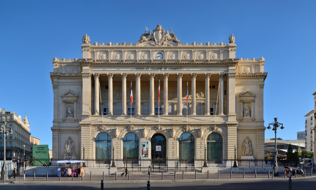 The Palais de la Bourse in Marseille, France, is a monumental building constructed in the mid-19th century to serve as the city’s Chamber of Commerce. Its grand architecture reflects the wealth and maritime power of Marseille during its peak as a major Mediterranean trading port. One of the building’s most notable features is its clock tower, which rises to about 55 meters.