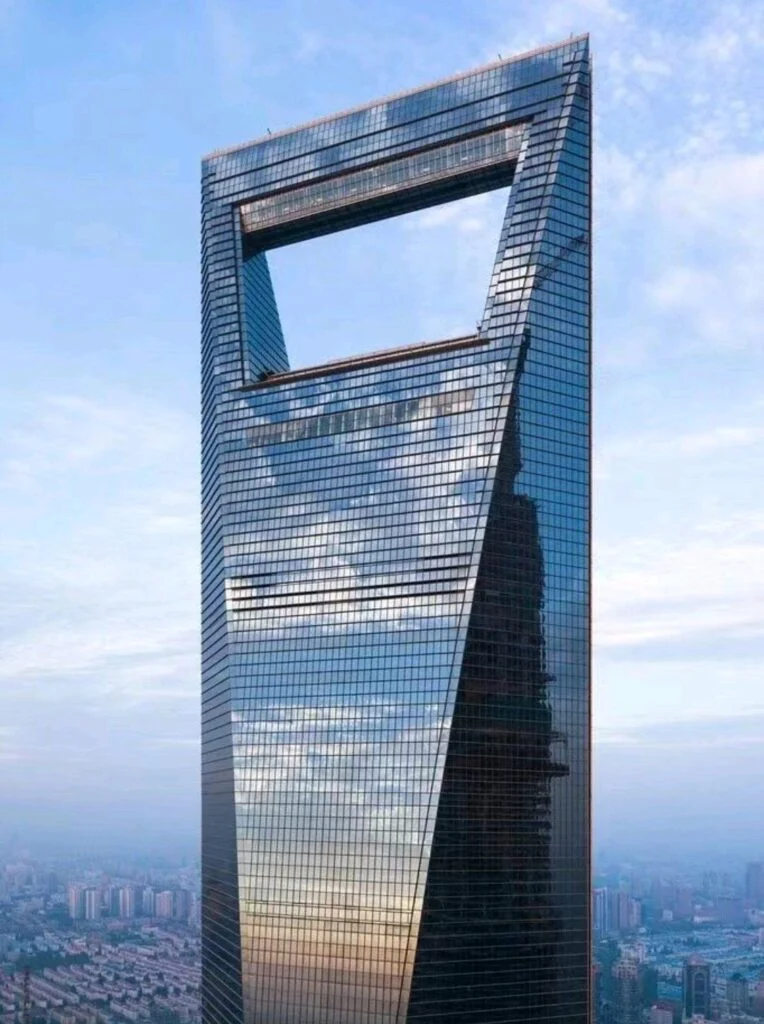 The Shanghai World Financial Center, completed in 2008, reaches a height of 492 meters with 101 floors. Its most distinctive feature is the large trapezoidal opening near the top, which has earned it the nickname “the bottle opener.” Located in the Lujiazui financial district, it stands alongside the Jin Mao Tower and the Shanghai Tower, forming one of the world’s most striking clusters of skyscrapers.
