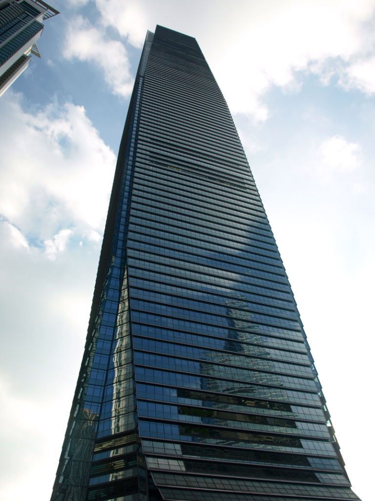 The Guangzhou International Finance Center, also known as the West Tower, stands 439 meters tall with 101 floors. Completed in 2010, it is part of a twin-tower complex that includes the taller Guangzhou CTF Finance Centre (East Tower). Its triangular form, clad in glass and steel, gives it a distinctive modern silhouette in Guangzhou’s rapidly growing skyline.