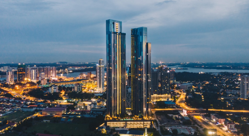 The taller tower has 72 floors, while the slightly shorter one has 67. Both towers are primarily residential, offering luxury condominiums with sweeping views of the Johor Strait and Singapore’s skyline. The design emphasizes elegance and exclusivity, catering to Malaysia’s rising affluent population and international investors.